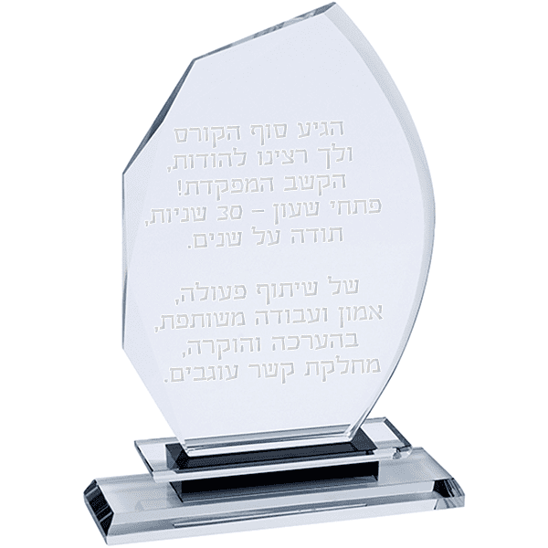 מגן הוקרה מזכוכית קריסטל עם חריטה אישית – מעוקל