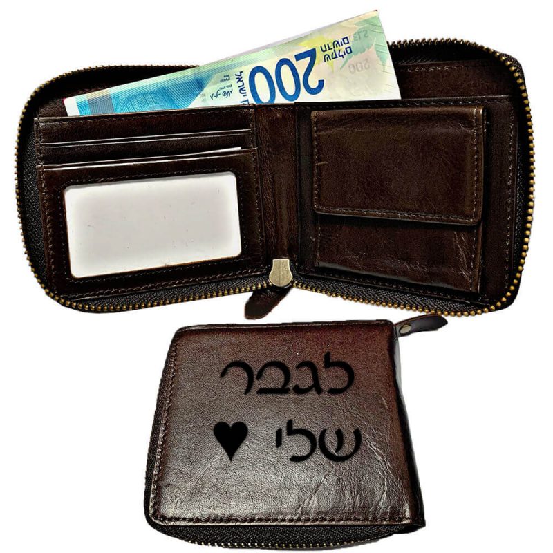ארנק עור לגבר מתקפל עם רוכסן וחריטה אישית