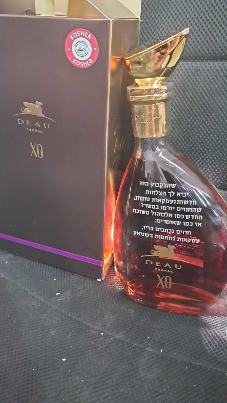 בקבוק קוניאק וכוסות עם חריטה של כיתוב ושמות