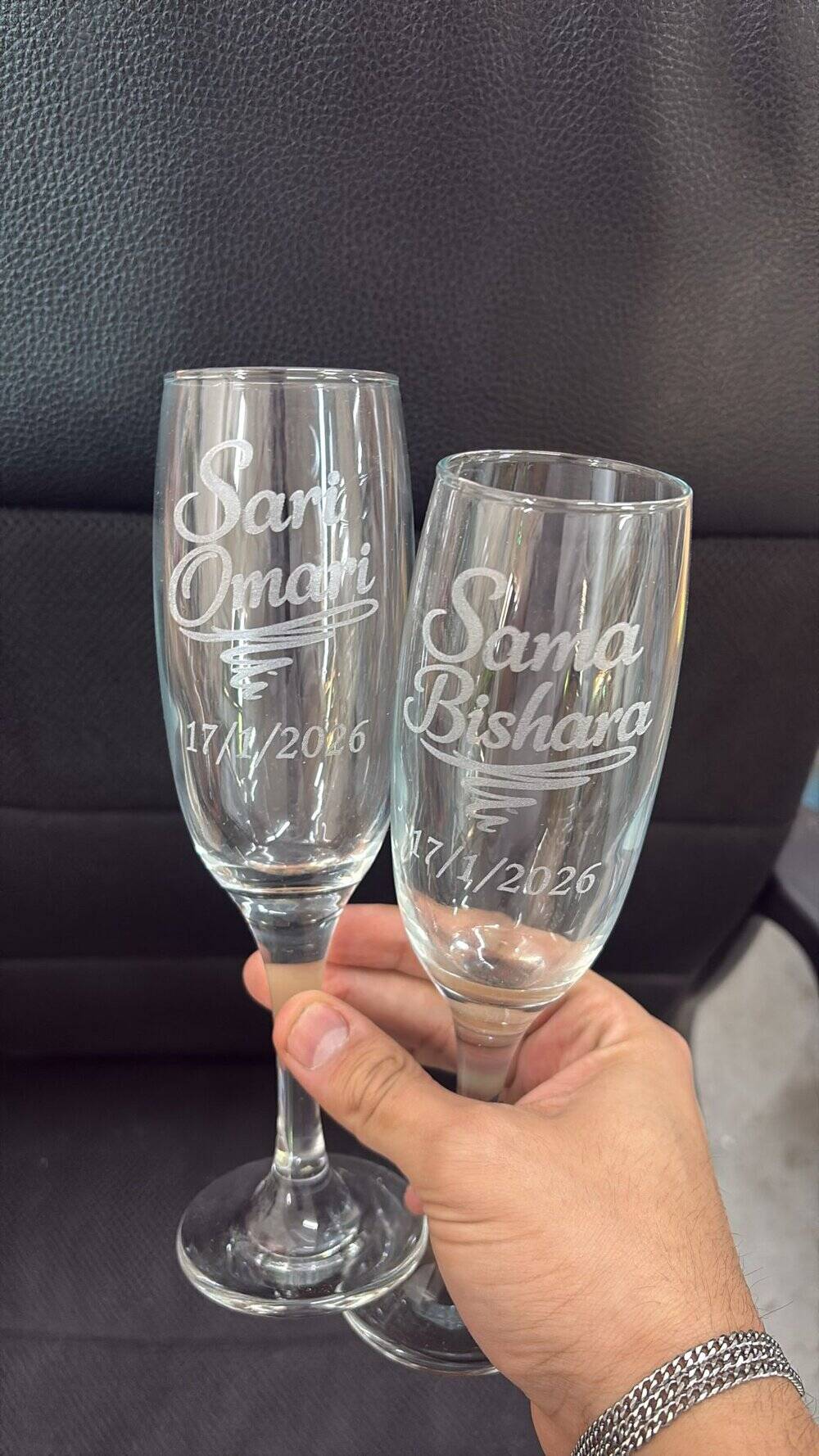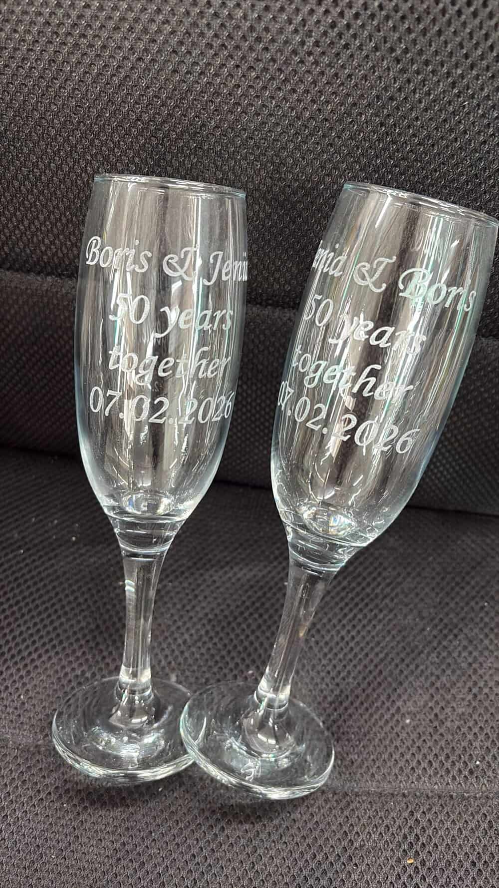 כוסות שמפניה עם כיתוב של שמות וחריטה אישית
