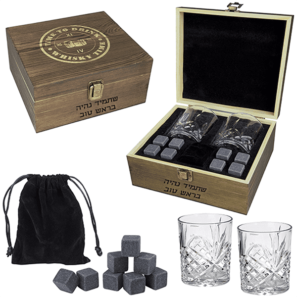 מארז מתנה וויסקי הכולל 2 כוסות ו-8 אבני קרח בקופסת עץ מהודרת עם חריטה אישית