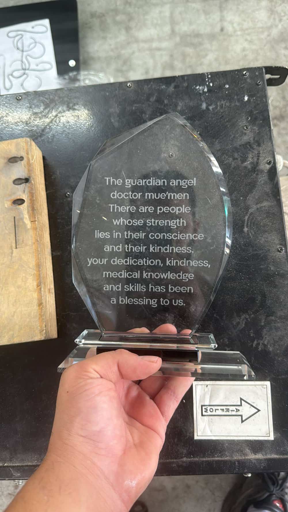 מגן הוקרה מזכוכית קריסטל עם חריטה אישית – מעוקל
