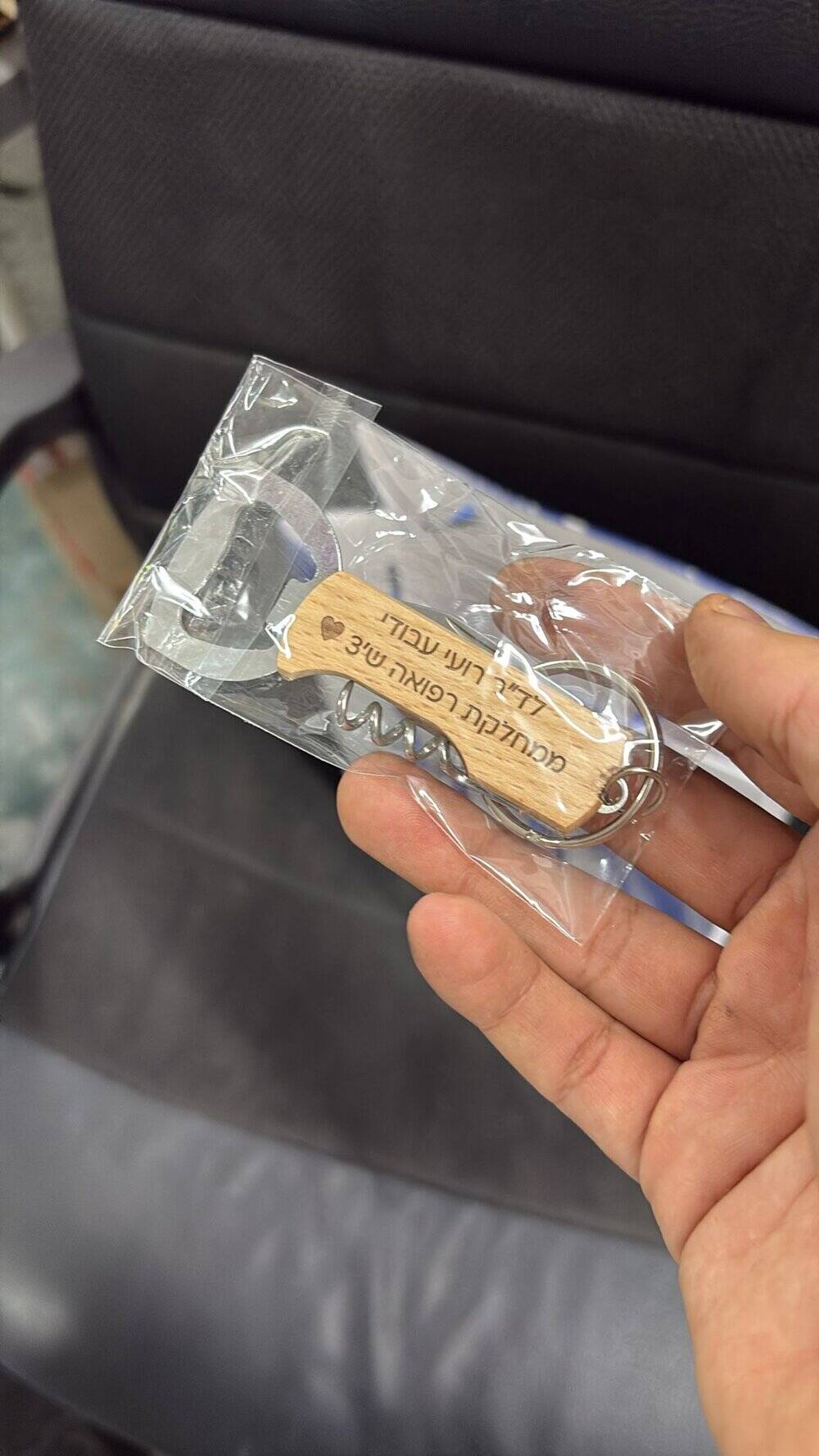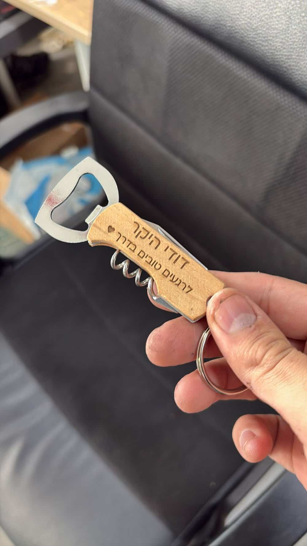 מחזיק המפתחות מגיע בצבע עץ בהיר וניתן להוסיף הקדשה אישית על גבי פותחן הבקבוקים, מה שהופך את הפותחן למתנה מרגשת ואישית לכל אדם קרוב לליבכם. גודל הפותחן הינו 4*8 ס"מ, והחריטה על גבי פותחן הבקבוקים נעשית באמצעות טכנולוגיית הלייזר המתקדמת בעולם.