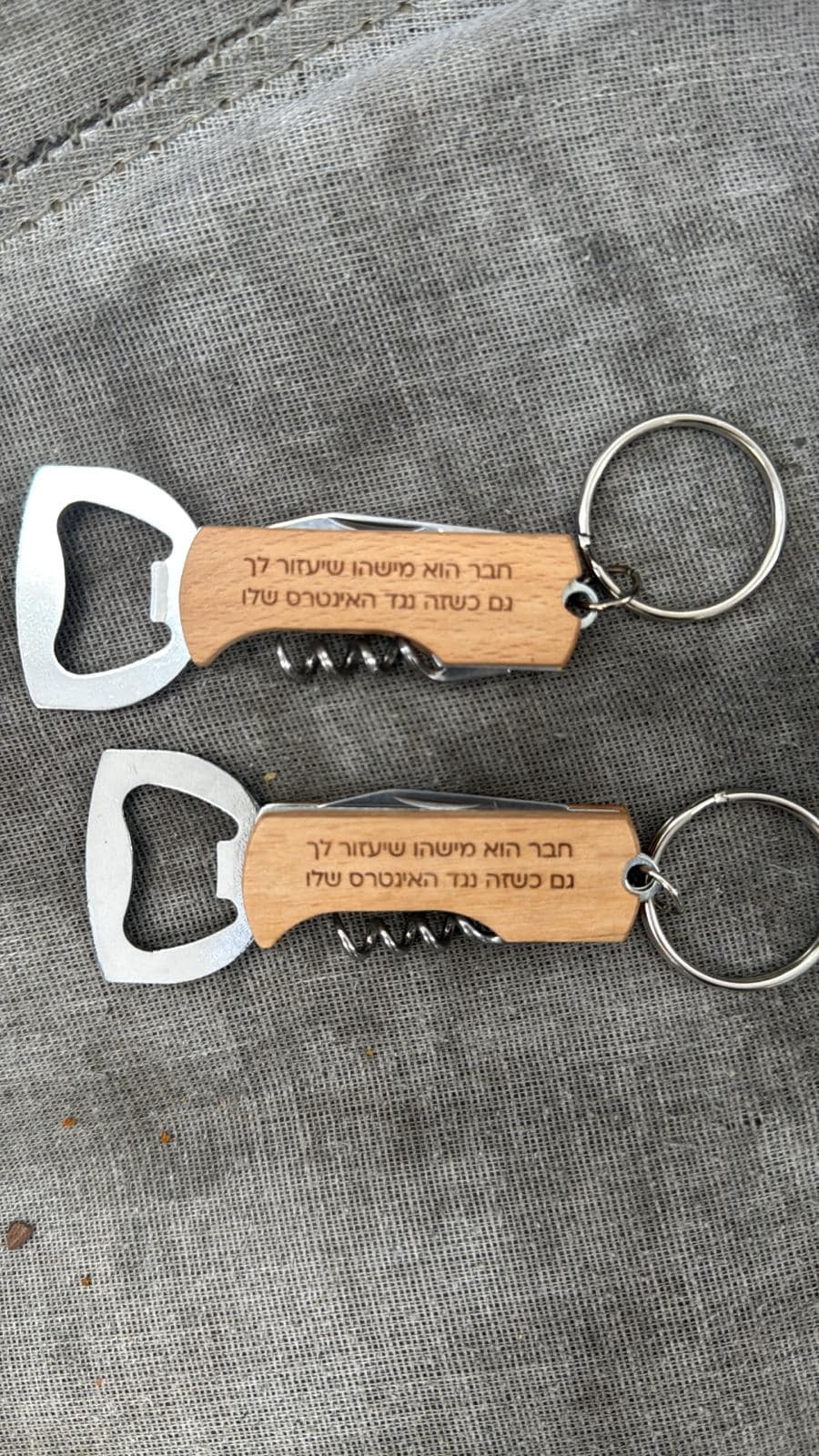 מחפשים מתנה מקורית ושווה לחבר יקר? מתנה שימושית ביותר לכל רגע נתון – פותחן בקבוקים המגיע כמחזיק מפתחות זאת המתנה המושלמת ביותר לכל חבר קרוב! מחזיק מפתחות סופר שימושי מעץ אמיתי ואיכותי במיוחד. פותחן בקבוקים עם 4 אפשרויות שונות כולל פותחן בירה וסכין נשלף – מה שהופך את פותחן הבקבוקים למתנה מקורית ביותר לכל מצב או מאורע בחיים!