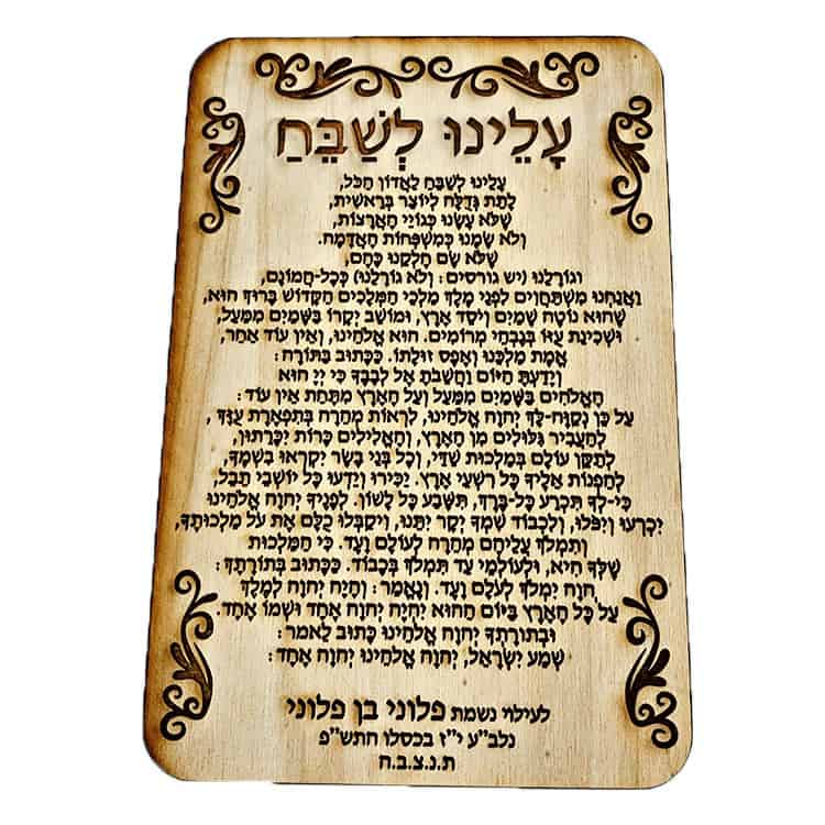 היהדות היא ללא ספק הדת הייחודית ביותר שקיימת כיום בעולם ולא רק בגלל התכנים שהיא מלאה בהם אלא בזכות האופי המיוחד של האנשים שעוקבים אחריה. את בתי הכנסת פוקדים יהודים ברחבי הארץ והעולם מידי יום ביומו ומתחברים לקדוש ברוך הוא בתפילה חרישית ויפה. דרך מופלאה להוסיף נוי ויוקרה לבית הכנסת השכונתי שלכם, תהיה כמובן לקשט אותו בשלט עם ברכת עלינו לשבח.